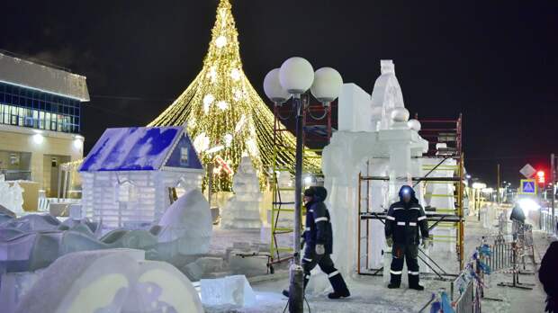 На площади у «Геолога» в Салехарде начался демонтаж ледяных фигур Деда Мороза и Снегурочки.
