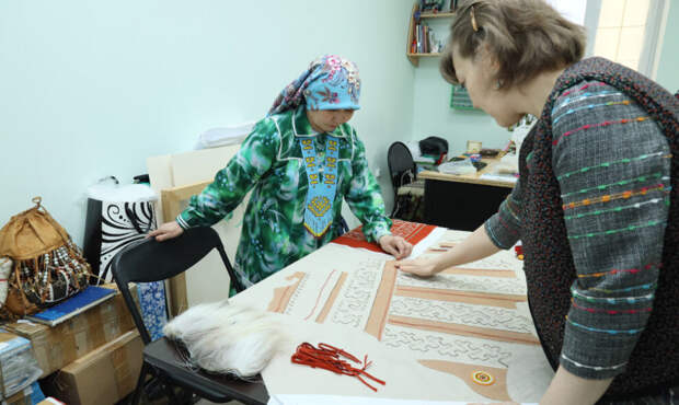 За два месяца было сделано немало: мастерицы выбрали самый характерный для региона орнамент, рассчитали его размер, определились с цветом и заполнили вышивкой контуры Ямала на полотне. Для этого использовали подшейный волос оленя и оленьи жилы.