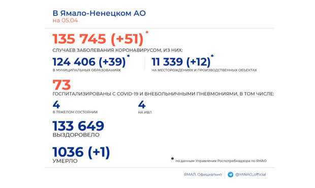 5 апреля 2022 года в ЯНАО 51 новый случай заболевания COVID-19 (за весь период – 135 745) 133 649 человек выздоровело 1 человек умер (за весь период – 1 036) 73 пациента госпитализировано с COVID-19 и внебольничными пневмониями 4 пациента в тяжелом состоянии 4 пациента с подтвержденным COVID-19 – на ИВЛ За сутки выявлено 12 […]